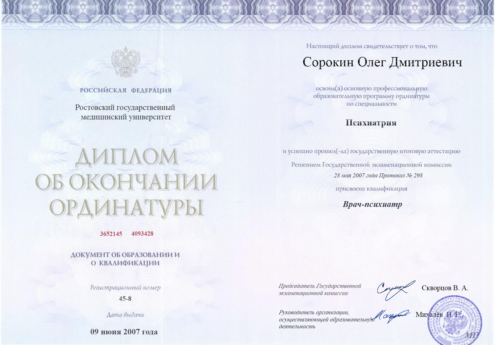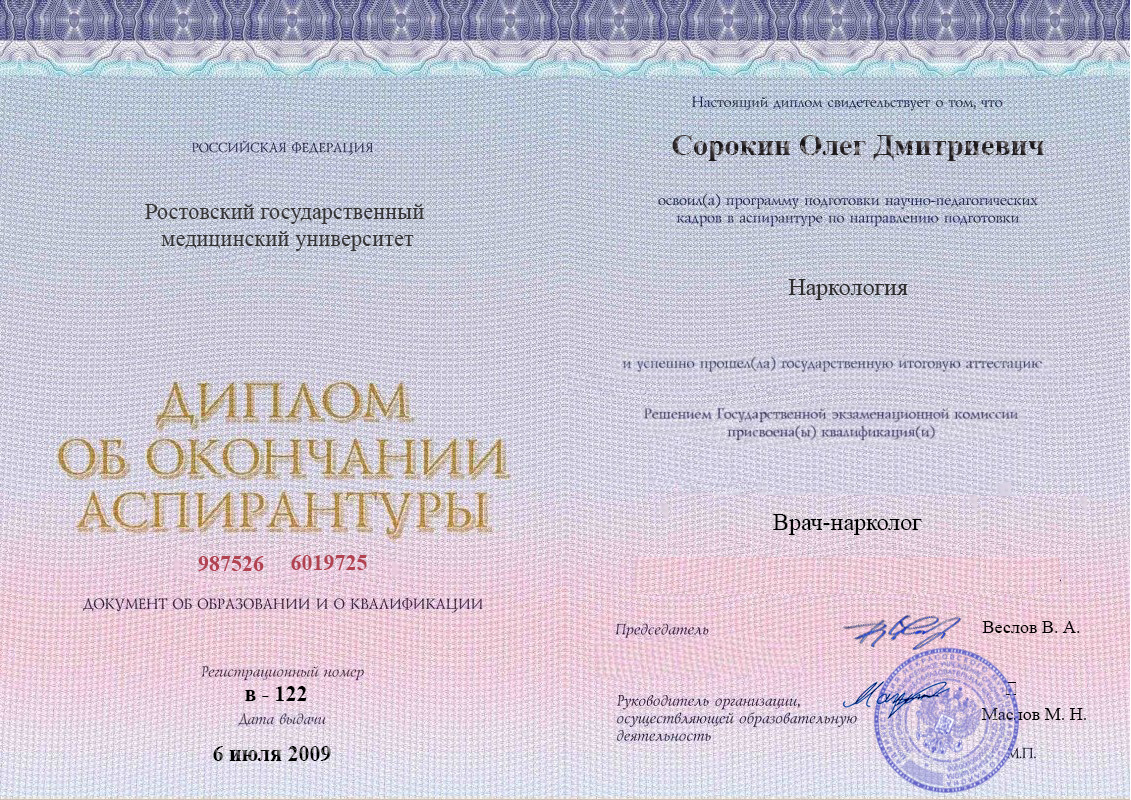Олег Дмитриевич Сорокин — высококвалифицированный психиатр с многолетним опытом в области диагностики и лечения психических расстройств и зависимостей. Окончил Ростовский государственный медицинский университет в 2004 году, получив диплом по специальности «Лечебное дело». В 2007 году окончил ординатуру по психиатрии, а после в 2009 году получил диплом аспирантуры по наркологии.
